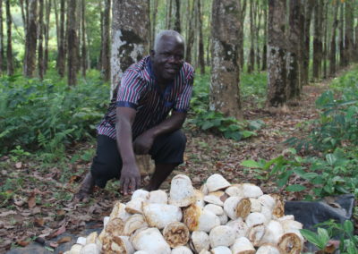 Le caoutchouc peut être récolté à l’état liquide – latex – ou après coagulation en champ (fonds de tasses). Il est ensuite acheminé à l’usine.